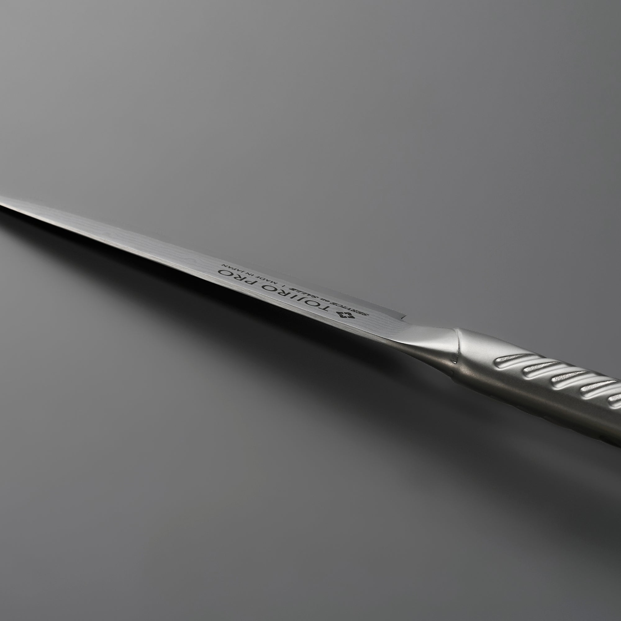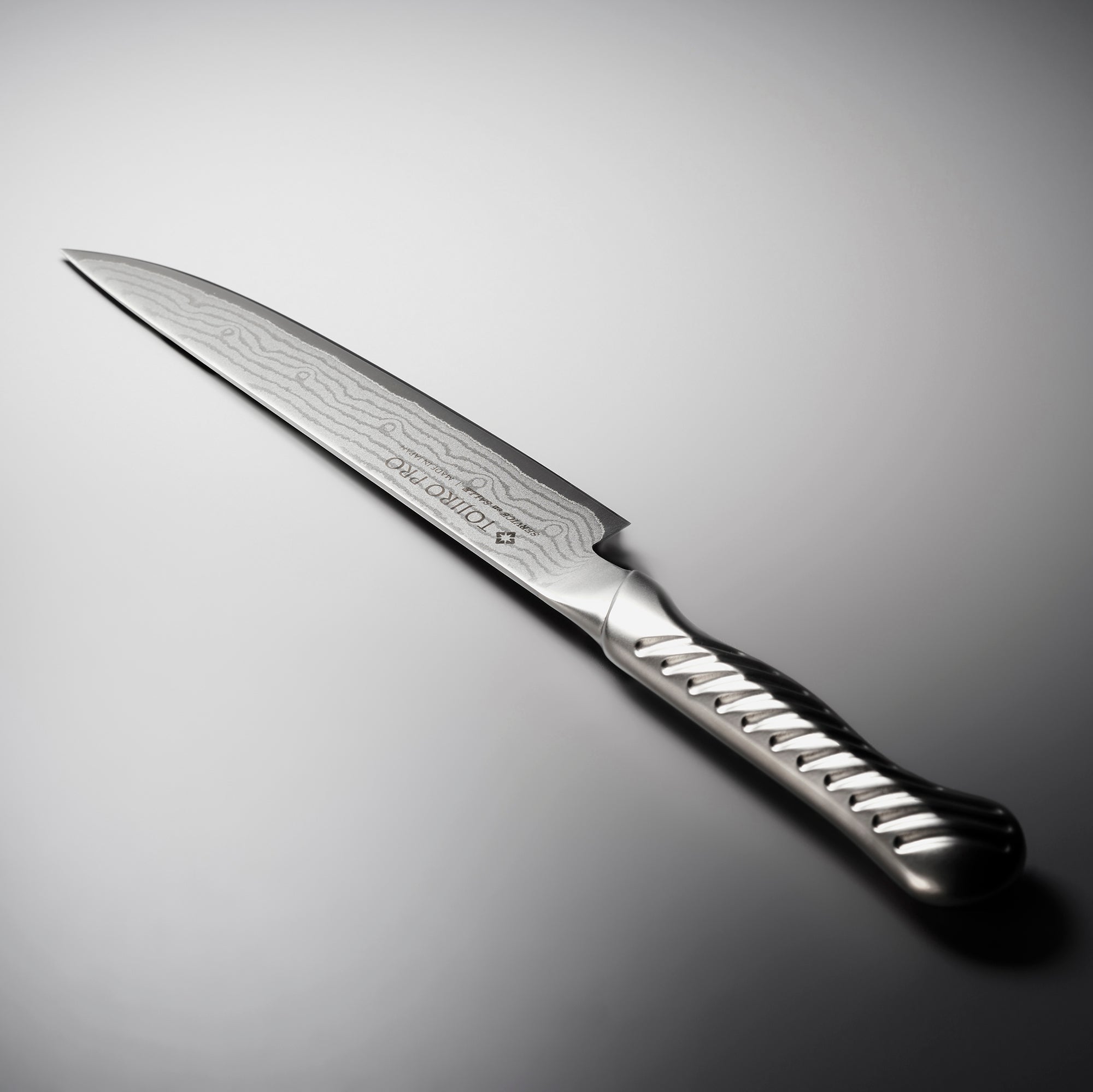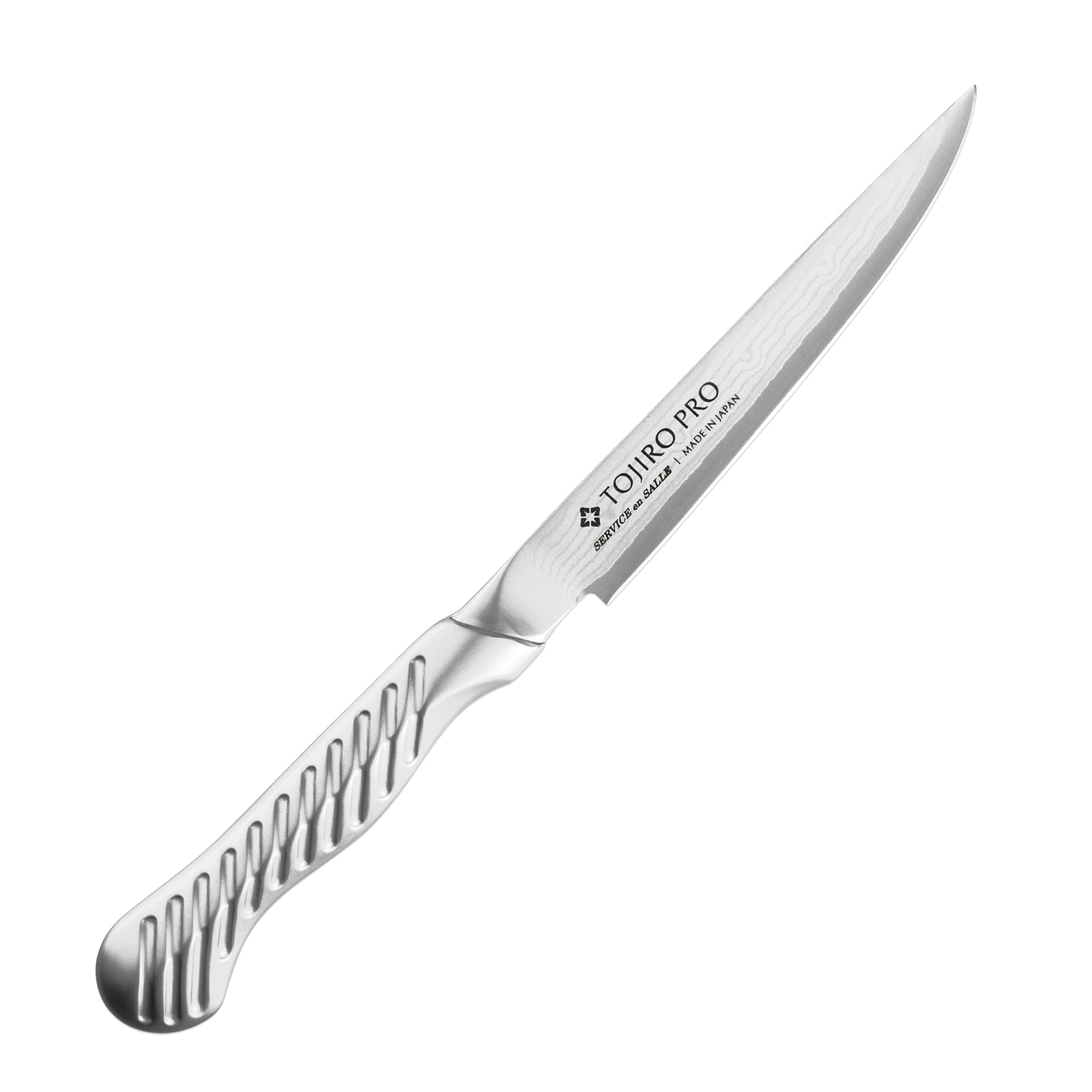 フランス料理文化センター監修のもと開発されたサーヴィス専用ナイフです。硬度の異なる2種類のステンレス鋼を何層にも重ね合わせることでうまれる優美なダマスカス模様。芯材のV金10号(VG10)の均一性が高まり鋭い切れ味を発揮します。サーヴィス独特の握り方に対応した特殊形状ハンドルが最高のパフォーマンスをサポートします。さらに、トルネード模様を施すことにより水や油の付いた手でも滑りにくく、快適に調理することができます。